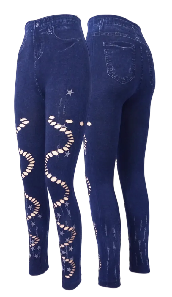 S vysokým pasem a širokou gumou v pase, tyto legíny skvěle drží a nikde neškrtí. Džínový design a potisk dodávají těmto legínám jedinečný a moderní vzhled, který se hodí ke každé příležitosti.